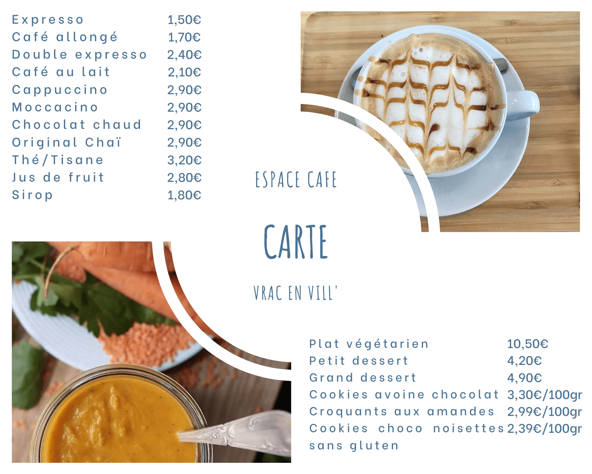 Voici une carte des boissons et plats proposés. Une plus grande sélection de biscuits vous attend en boutique !